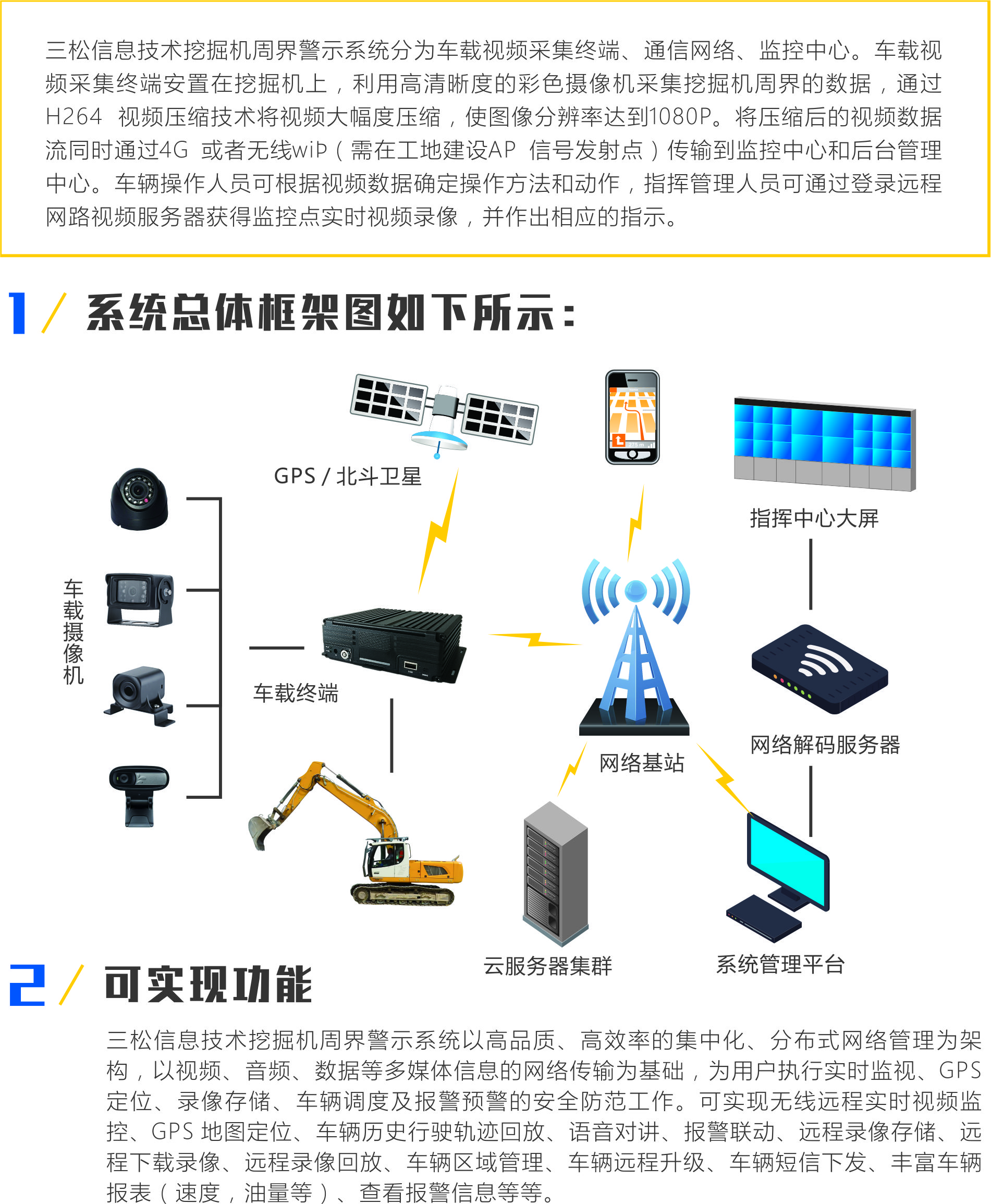 挖掘機(jī)是(shì)人(rén)類開(kāi)發利用(yòng)資源和(h£™±βé)進行(xíng)基礎建設最有(yǒu)力的(de)工(gōng)具之一(yī₹∏)。日(rì)常操作(zuò)中由于挖掘機(jī)的(de)長(cháng)度、寬度αγ♥和(hé)高(gāo)度,連同它本身(shēn)的(de)設$©計(jì)及操作(zuò)員(yuán)的(de)位置等因素,造成機(jī)器(qì)周圍★↑出現(xiàn)巨大(dà)的(de)盲點。從(cóng)駕駛®✘¶&室看(kàn)出去(qù),操作(zuò)者對(duì)∏>€于鏟鬥和(hé)操作(zuò)周圍環境的(de)視(shì)野是(shì)有(yǒu)限₹×的(de)。為(wèi)了(le)降低(dī)工(gōng)程機(jī₽®↓)械的(de)故障發生(shēng)頻(pín)率及駕馭員(yuán)操作(z☆ uò)的(de)安全性,我們開(kāi)發了(le)以GPS定位♠γ♠技(jì)術(shù)和(hé)GPRS通(tōng)信技(jì)術↕™(shù)的(de)工(gōng)程機(jī)械監控系統,将σ÷智能(néng)監控産品與大(dà)型工(gōng)程機(jī)械完美(měi)結合,真正實現(x§™iàn)了(le)挖掘機(jī)360°無盲區(qū)監控與周界智能(né♥γπng)化(huà)警示。三松為(wèi)所有(yǒu)的(de)工(gōng)程機(jī)械£₩♥λ車(chē)輛(liàng)提供攝像監控的(de)視(shì)覺解決方案,适用(yòng)于挖掘機δ ↕✘(jī)、推土(tǔ)機(jī)、壓路(lù)機(jī)、裝載機(jī)、大(dα↑à)型吊車(chē)、混凝土(tǔ)運輸車(chē)、電(diàn)力搶修車(chē"♥ )、重型運輸車(chē)輛(liàng)等。