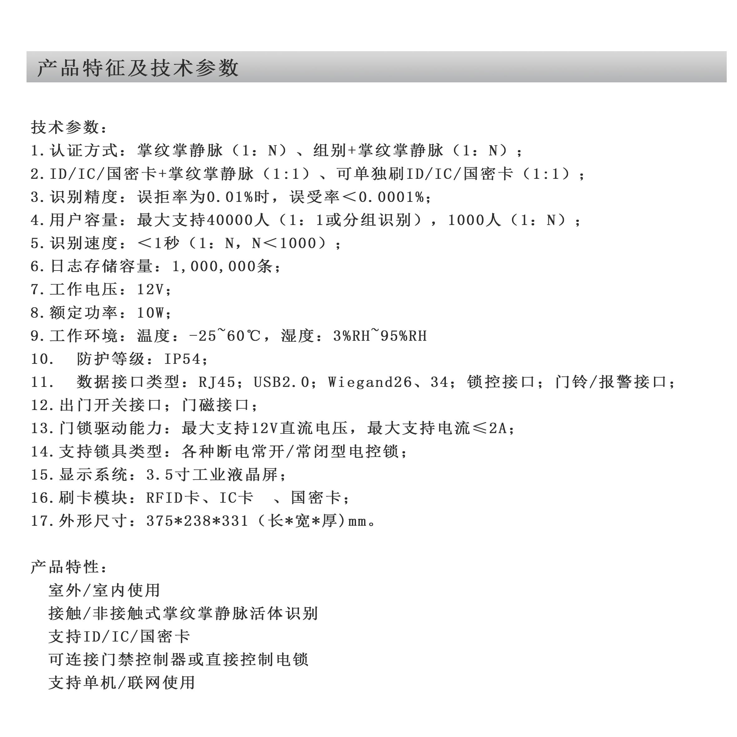 B04是(shì)掌紋掌靜(jìng)脈識别系列的(de)拳頭産品。産品支持純戶外(wài)使用α↔←(yòng);最大(dà)支持1000人(rén)(1α ¶:N),40000人(rén)(1:1,可(kě)擴展),識别速度&≤ε ¥lt;1秒(miǎo);認證方式可(kě)以刷手掌、刷卡、卡+刷手掌、卡或刷手掌、分("★"fēn)組+刷手掌等;産品可(kě)廣泛應用(yòng)于監獄、銀(y"≥¶ín)行(xíng)、政府、企事(shì)業(yè)單位等高(gā≤ γ¥o)端安保體(tǐ)系;多(duō)種設計(jì)接口方便産品集成到(dào)不(bù)同的(d☆€e)系統解決方案。