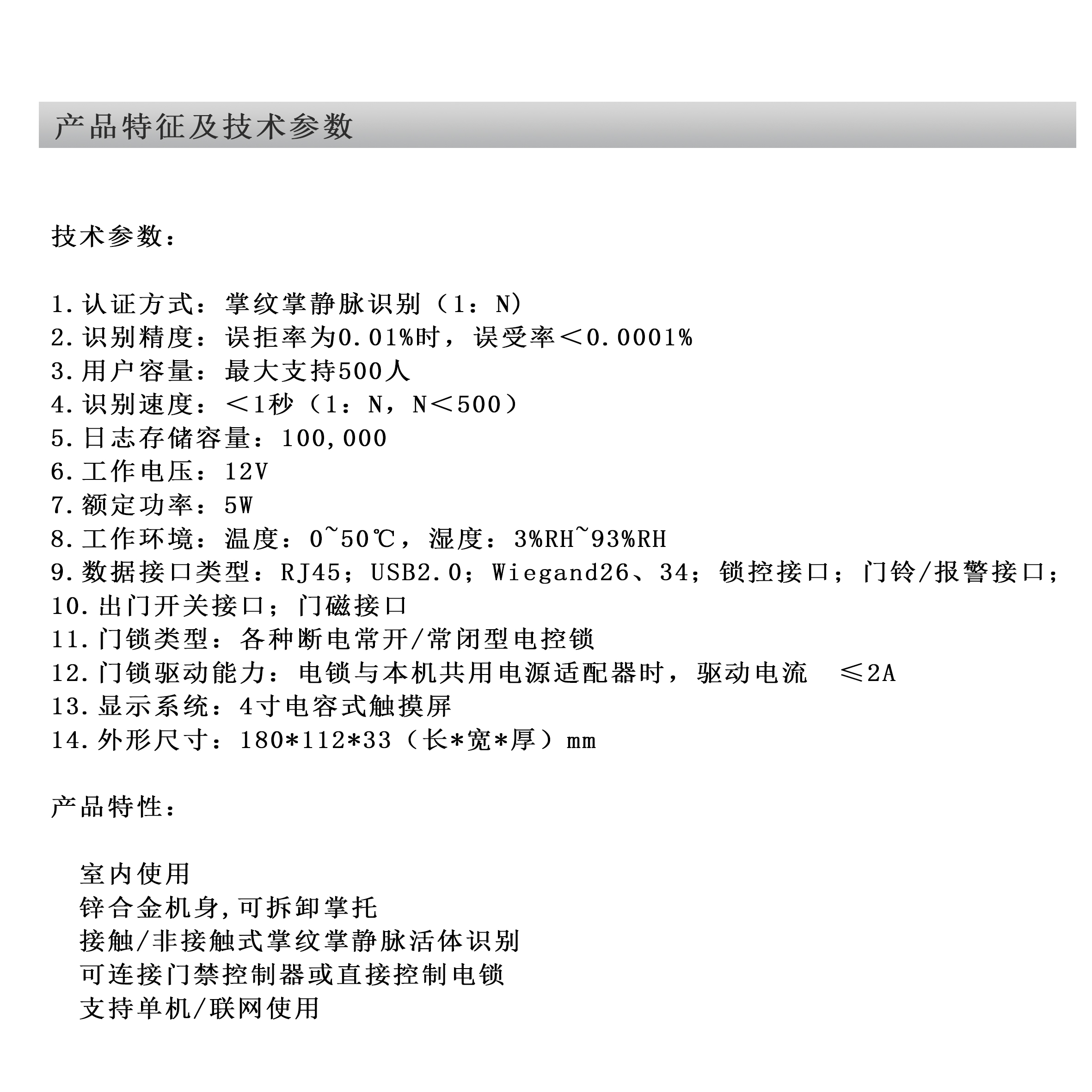 掌通(tōng)掌紋掌靜(jìng)脈識别機(jī)為(wèi)最新一(yī)代掌紋掌靜(jìng)脈識别産品₽™¥。産品可(kě)室內(nèi)使用(yòng);最大(dà)支持500人(ré∞™'∏n)(1:N);識别速度<1秒(miǎo);認證方式:刷手掌;産品采用(yòng)鋅合金(j €īn)金(jīn)屬外(wài)殼,可(kě)摘卸式掌托适合于不(←®€bù)同環境下(xià)的(de)應用(yòng)需求;多(duō ®₩)種設計(jì)接口方便産品集成到(dào)不(bù)同的(de←$ )系統解決方案。
