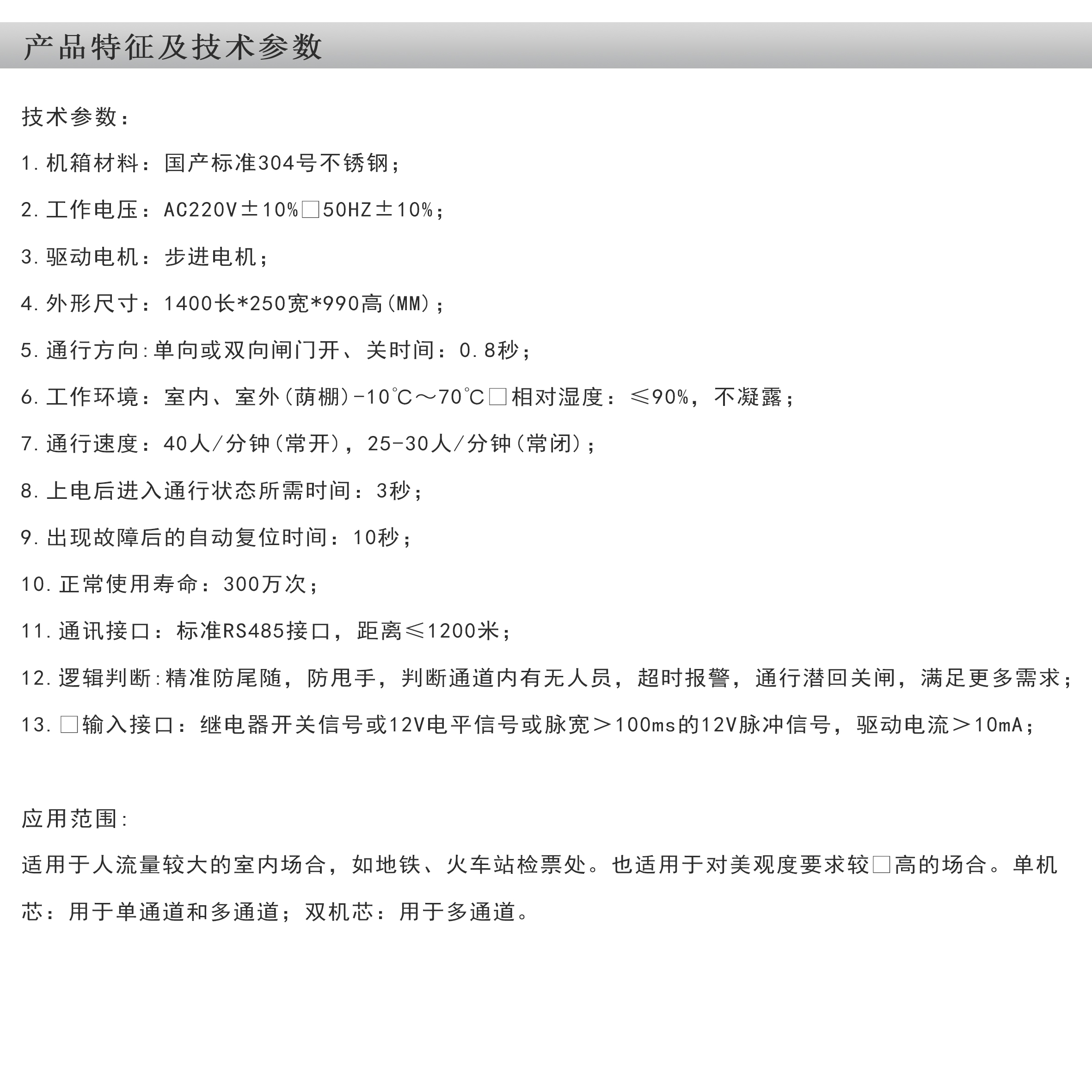 整個(gè)産品外(wài)形采用(yòng)國(guó)産标準(304号)不(bù)鏽鋼闆↑$沖壓成型, 造型美(měi)觀大(dà)方,防鏽、耐用(yòng),能(néng£γ✘)抵抗外(wài)力破壞。可(kě)集成掌紋掌靜(jìng)脈識别機(jī)進行(xíβ¥↕§ng)人(rén)員(yuán)出入口控制(zhì),杜絕非法出入,并在緊急情況σ•£下(xià)快(kuài)速開(kāi)閘,起消防通(tōng)道(dào)作(zuò)用₩•(yòng)。